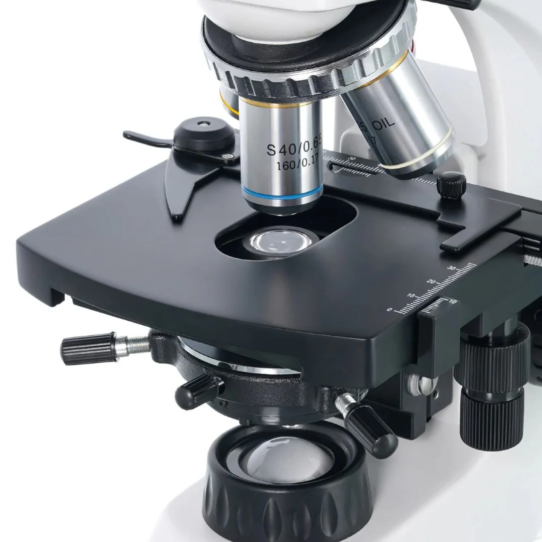 Existe un micrómetro mecánico para sujetar los portaobjetos de microscopio. En la parte inferior se encuentra una lámpara LED brillante y una lente colectora. El brillo de la iluminación es ajustable. El sistema de iluminación también incluye un condensador Abbe con un diafragma iris que permite ajustar la intensidad luminosa. Este microscopio permite utilizar filtros de luz.